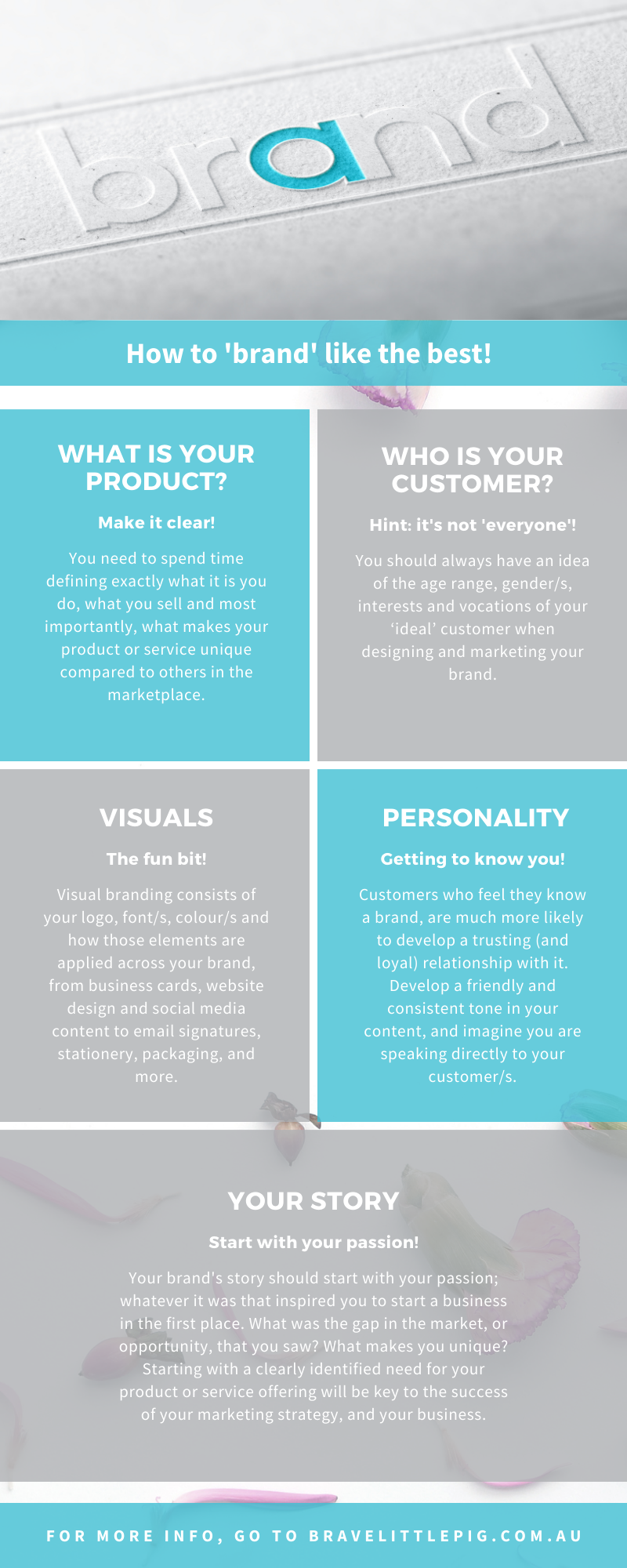 A personal or business brand isn’t just a clever business name or stunning logo; it’s every element of your visual branding, marketing content, and how you engage with your customers or clients at each point of contact – the whole package!